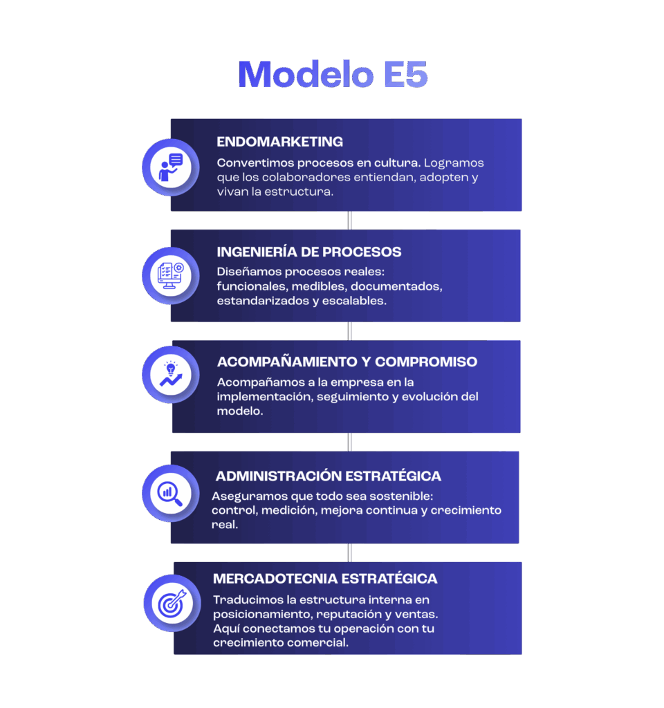 Eleva Cinco es una firma de crecimiento empresarial que integra ingeniería de procesos, mercadotecnia estratégica y administración para ayudar a las empresas a estructurarse, alinearse y crecer de manera sostenible.